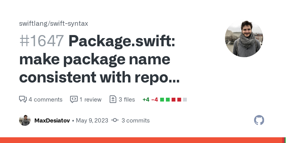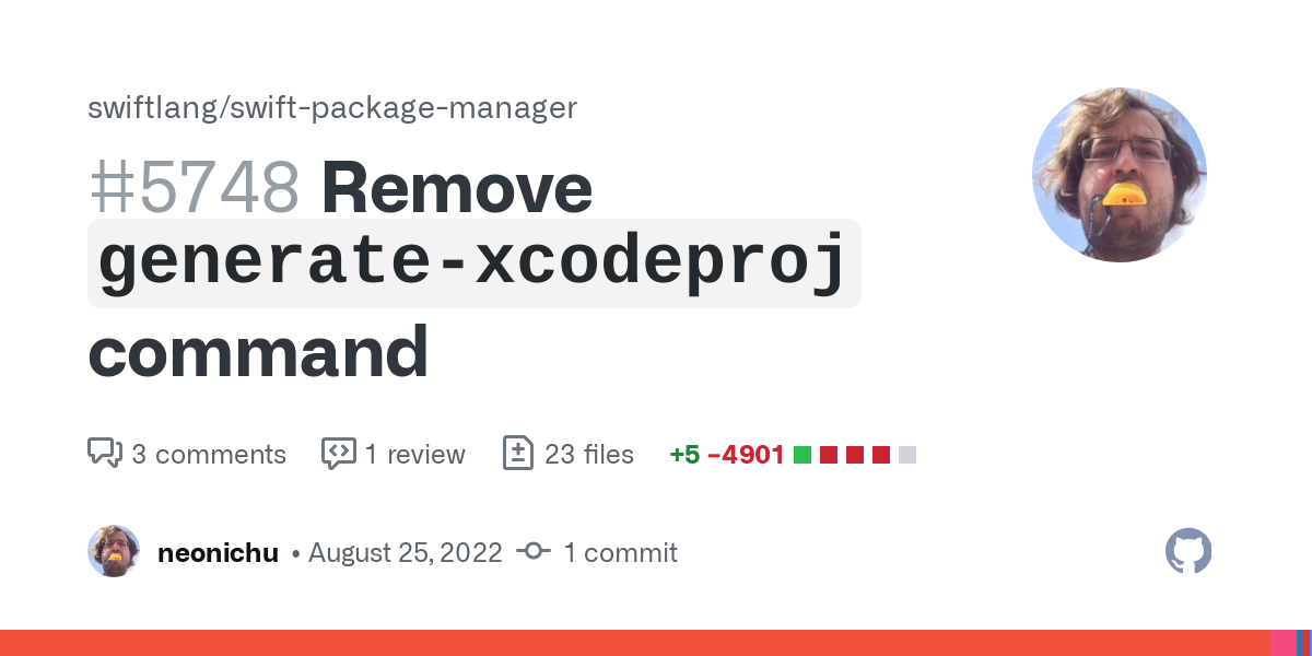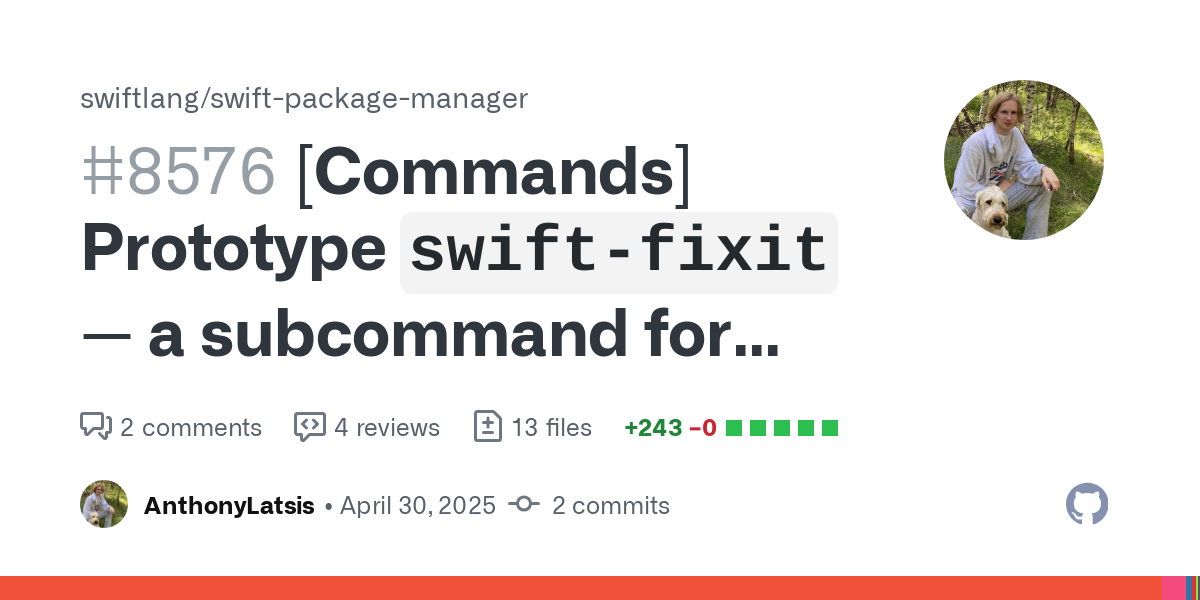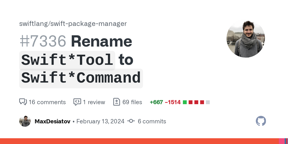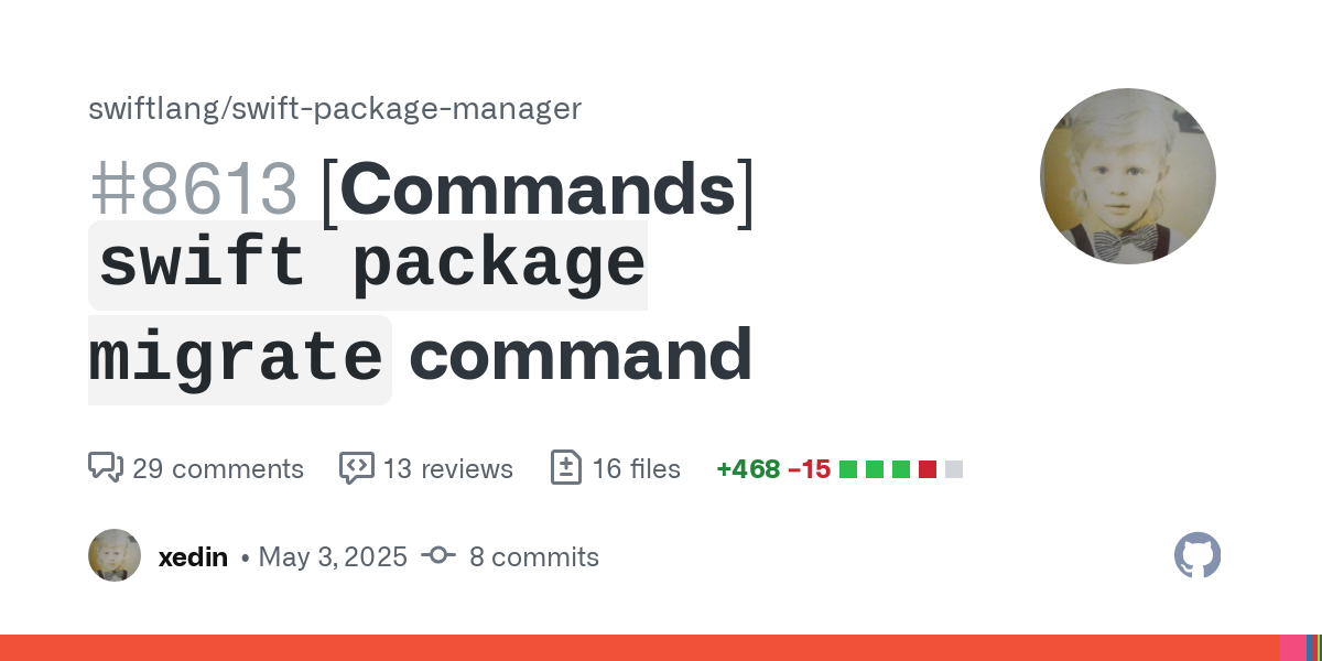 .revision → revision: の対応があるんだけど、 .upToNextMinor の対応が存在しなくて、コメントからするとそれが exact: に見える で .exact の対応してそうな exact: は消えた?.upToNextMinor はドット形式で今後も書けるのか。ただし実はドットがついてる左辺値型が変わるのか。.latestStable 的なものも欲しいですが、そこらへん何か議論あったりしますかね .upToNextMajor に直さないといけないので、他のパッケージが全部 .latestStable だったら、「あこの .upTpNextMajor のものはメジャーアプデがあるから移行対応しないとだな」ってすぐわかるswift run でコマンドラインツールを走らせたときに SIGINT で止まらなくなって困っていたんですが,意外と Jira でも Forums でも Pull requests でもそれらしい言及がなかったので原因を探って PR を出してみました.困っている人は本当に困っていそうな問題なので共有してみます. 理解が間違っているところとかがあればご指摘いただけると嬉しいです. https://github.com/apple/swift-package-manager/pull/4224swift run でコマンドラインツールを走らせたときに SIGINT で止まらなくなって困っていたんですが,意外と Jira でも Forums でも Pull requests でもそれらしい言及がなかったので原因を探って PR を出してみました.困っている人は本当に困っていそうな問題なので共有してみます. 理解が間違っているところとかがあればご指摘いただけると嬉しいです. https://github.com/apple/swift-package-manager/pull/4224 Showing Recent Issues The operation couldn’t be completed. (SwiftPM.SPMRepositoryError error 5.) 特定のパッケージを更新して Package.swift を resolve しようとすると発生しました。 詳細は以下のスレッドに載せています。 https://twitter.com/the_uhooi/status/1505577290444713989?s=20&t=OtpKypkRTqgGV1873rtONA (edited)~/Library/Developer/Xcode/DerivedData ディレクトリを消したら直りました。