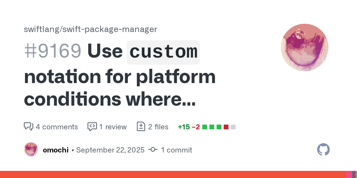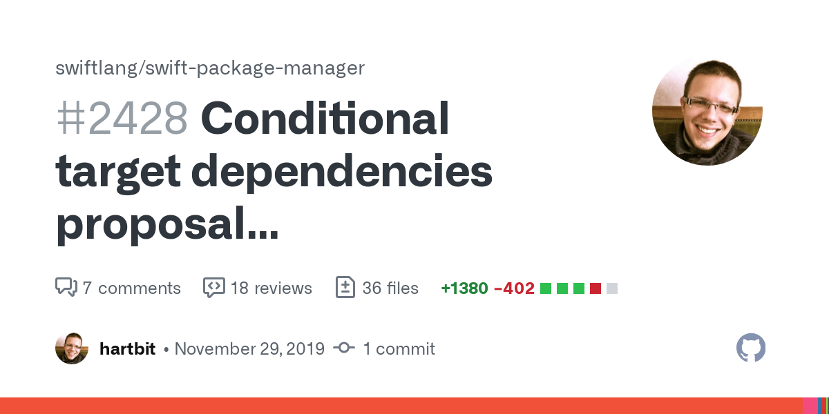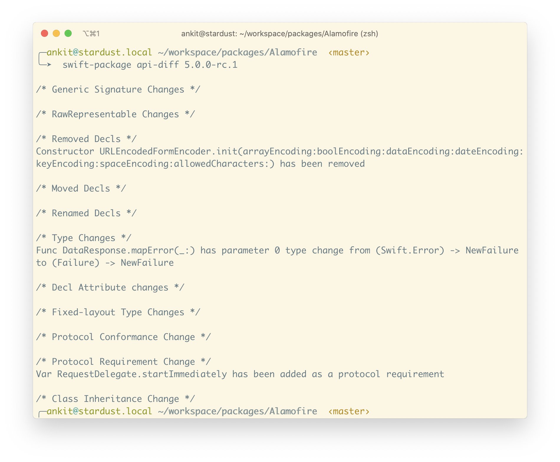 DEBUG が渡らないだけじゃなくて、 -c が Package.swift を debug/release のどちらで実行するかに影響を与えるわけではない( -c release でも debug っぽい)みたいでダメだった。Package.swift のロード(実行)のコマンドは https://github.com/apple/swift-package-manager/blob/106115d356f750223dbd4419c3f39f8fc2da66f7/Sources/PackageLoading/ManifestLoader.swift#L310-L329 この辺だと思っていて、そこでconfigurationを渡していないようなので。渡すようにしたPR出すのはありやなしや。-c は Package.swift についてではないよなぁという気もしますね。それよりも DEBUG 等が Package.swift にも渡される方が良さそう?-c debugの時は-D DEBUGも指定、くらいが妥当そうvar disableWhenDebug: Bool があってスイッチできる、みたいな感じで。error: 'iso8601' is only available on OS X 10.12 or newer public static let dateDecodingStrategy: JSONDecoder.DateDecodingStrategy = .iso8601 ↓でいちおうビルドできるんですが、もっと Swift PM 的に良い方法はないかなと。 swift build -Xswiftc "-target" -Xswiftc "x86_64-apple-macosx10.12" if #available(OSX 10.12, iOS 10.0, watchOS 3.0, tvOS 10.0, *) { を使わずに?dateDecodingStrategy にアクセスした箇所全部で分岐が必要になってしまうので・・・。extension JSONDecoder.DateDecodingStrategy { @available(OSX, obsoleted: 10.11) static var iso8601 = JSONDecoder.DateDecodingStrategy.formatted({ let formatter = DateFormatter() formatter.calendar = Calendar(identifier: .iso8601) formatter.locale = Locale(identifier: "en_US_POSIX") formatter.dateFormat = "yyyy'-'MM'-'dd'T'HH':'mm':'ss'Z'" formatter.timeZone = TimeZone(secondsFromGMT: 0) return formatter }()) } とかやってみたけど、候補を探すときに@availableを考慮してくれなくてダメだった。 Compile Swift Module 'Foo' (1 sources) /Users/norio/github/Foo/Sources/Foo/Foo.swift:17:37: error: ambiguous use of 'iso8601' decoder.dateDecodingStrategy = .iso8601 ^ Foundation.JSONDecoder:7:14: note: found this candidate case iso8601 ^ /Users/norio/github/Foo/Sources/Foo/Foo.swift:5:16: note: found this candidate static var iso8601 = JSONDecoder.DateDecodingStrategy.formatted({ ^swift-DEVELOPMENT-SNAPSHOT-2018-10-01-aでswift run --replが出来る様になりました。 https://github.com/apple/swift-package-manager/pull/1793.spm.shellEscaped 式にできそうだねswift test --parallel --xunit-output result.xmlとか出来る様になってたの知らなかった。 https://github.com/apple/swift-package-manager/commit/047df6464ab15e27ab19b9a8263caeaf32127065--xunit-outputを使うには--parallelが必要。--xunit-outputは未完成の機能だから--helpには出てこないらしい。xcpretty -r junitとかで生成してるのが不要になる。dlopenで動的にロードする事は頑張れば出来そうな気もしますが、試した事は無いです。dlopenも無理かな。swift-DEVELOPMENT-SNAPSHOT-2019-03-04-aには含まれてるみたいですよ。POSIXモジュールを削除するPR https://github.com/apple/swift-package-manager/pull/2053master にも swift-5.0-branch にも PackageDescriptionV5.md がない? https://github.com/apple/swift-package-manager/tree/swift-5.0-branch/DocumentationSources/${target}/include/${target}.h が置いてあり、かつ、 modulemapが置いてない ときに限ってswift package generate-xcodeproj の挙動ならば、僕が提案したモノですね。module.modulemapを生成して、それ経由でリンクしていたはずです。 https://github.com/apple/swift-package-manager/pull/1406 .library(name: "PaperDynamic", type: .dynamic, targets: ["Paper"]),Leave this parameter unspecified to let to let the Swift Package Manager choose between static or dynamic linking (recommended). オススメはSwiftPMに任せる、なんですね。$ swift test --generate-linuxmain warning: can't discover tests on Linux; please use this option on macOS instead #if os(macOS)でmac専用のテストを書いている場合、mac上でgenerate-linuxmainするとそれらも含まれてしまうので微妙……Load command 20 cmd LC_RPATH cmdsize 120 path /Applications/Xcode-beta.app/Contents/Developer/Toolchains/XcodeDefault.xctoolchain/usr/lib/swift/macosx (offset 12)Load command 20 cmd LC_RPATH cmdsize 32 path /usr/lib/swift (offset 12) Load command 21 cmd LC_RPATH cmdsize 40 path @executable_path/../lib (offset 12)DYLD_LIBRARY_PATHをチェックして、rpathへ設定するパッチ。 @@ -0,0 +1,35 @@ diff --git a/Package.swift b/Package.swift index 8234442cbb68248f8c541e8af979c538c72df0a6..abf133e63098c7bf46cb28bb971e21afae5e462b 100644 --- a/Package.swift +++ b/Package.swift @@ -1,4 +1,4 @@ -// swift-tools-version:4.2 +// swift-tools-version:5.0 //===----------------------------------------------------------------------===// // // This source file is part of the Swift.org open source project @@ -12,6 +12,7 @@ //===----------------------------------------------------------------------===// import PackageDescription +import Foundation let package = Package( name: "swift-format", @@ -64,7 +65,15 @@ let package = Package( "SwiftFormatConfiguration", "SwiftFormatCore", "SwiftSyntax", - ] + ], + linkerSettings: { () -> [LinkerSetting] in + if let DYLD_LIBRARY_PATH = ProcessInfo.processInfo.environment["DYLD_LIBRARY_PATH"]? + .components(separatedBy: ":") { + let flags = DYLD_LIBRARY_PATH.flatMap { ["-rpath", $0] } + return [.unsafeFlags(flags)] + } + return [] + }() ), .testTarget( name: "SwiftFormatRulesTests",from: ではなく .branch("...") でレポジトリを指定してあるとして、branch のコミットが進んだときに「そのブランチの最新コミットを fetch し直す」ってできるんでしょうか?( .build と Package.resolved を消して swift build し直せばできるのですが…) (edited). ├── P