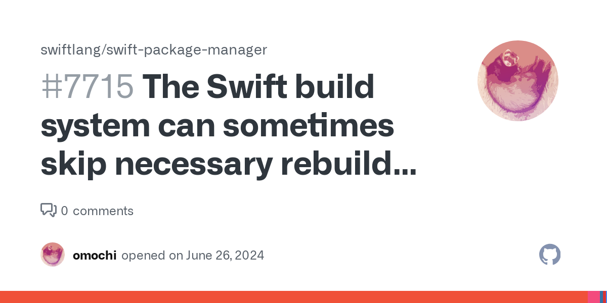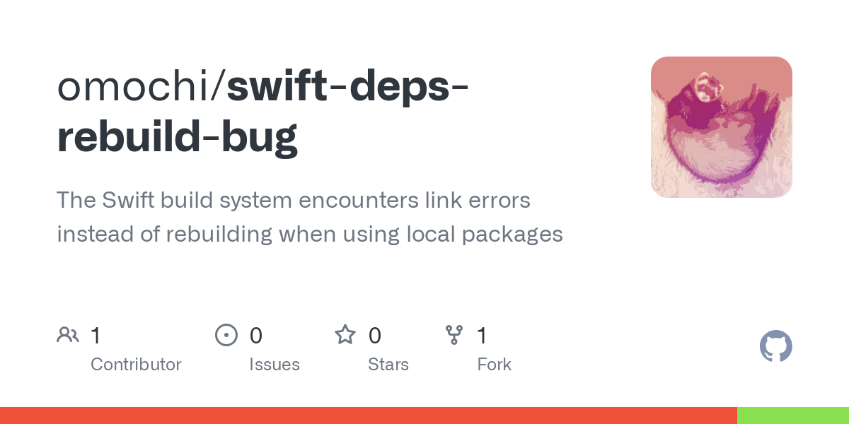 --from → --from-vrersion だなswift package completion-toolがswift package completion-commandにしれっと変わっているのを知った。 https://github.com/apple/swift-package-manager/pull/7336# A function which filters options which starts with "-" from $argv. function _swift_swift_preprocessor set -l results# A function which filters options which starts with "-" from $argv. function _swift_swift_preprocessor set -l resultsNo such file or directory: '/Users/XXX/Library/Developer/Xcode/DerivedData/UIKitPlayground-drqizwqmrobvwngdzdetphhibhsl/Build/Products/Debug-iphonesimulator/PackageFrameworks/RxSwift-Dynamic.framework/RxSwift-Dynamic' サンプルプロジェクト: https://github.com/dazy1030/UIKitPlayground/tree/rxswift-dynamic$ git clone https://github.com/omochi/swift-deps-rebuild-bug $ cd swift-deps-rebuild-bug $ ./repro.bash ↑のステップを実行して、最後にリンクエラーが出れば再現成功+ pwd /home/katei/ghq/github.com/omochi/swift-deps-rebuild-bug + cd AppPackage + swift package clean + swift build Building for debugging... [30/30] Linking app Build complete! (3.71s) + cd .. + cd ToyboxPackage/Sources/ToyboxCore + sed 's/a: Int = 0/a: Int = 0, b: Int = 0/' Debug.swift + mv -f Debug.2.swift Debug.swift + cd ../../../AppPackage + swift build Building for debugging... error: link command failed with exit code 1 (use -v to see invocation) /home/katei/ghq/github.com/omochi/swift-deps-rebuild-bug/AppPackage/Sources/AppModule/App.swift:9: error: undefined reference to '$s10ToyboxCore8toyDebug1aySi_tF' clang: error: linker command failed with exit code 1 (use -v to see invocation) [14/16] Linking codegen$ swiftc --version Swift version 6.0-dev (LLVM 4e9ab6351de9f4d, Swift d1343dc55bac19f) Target: x86_64-unknown-linux-gnu[omochi@omochi-mbp swift-deps-rebuild-bug (main =)]$ ./repro.bash + pwd /Users/omochi/github/omochi/swift-deps-rebuild-bug + cd AppPackage + swift package clean + swift build Building for debugging... [24/24] Applying app Build complete! (0.95s) + cd .. + cd ToyboxPackage/Sources/ToyboxCore + sed 's/a: Int = 0/a: Int = 0, b: Int = 0/' Debug.swift + mv -f Debug.2.swift Debug.swift + cd ../../../AppPackage + swift build Building for debugging... error: link command failed with exit code 1 (use -v to see invocation) Undefined symbols for architecture arm64: "ToyboxCore.toyDebug(a: Swift.Int) -> ()", referenced from: AppModule.App.main() -> () in App.swift.o ld: symbol(s) not found for architecture arm64 clang: error: linker command failed with exit code 1 (use -v to see invocation) error: fatalError [9/14] Linking app$ swift package clean しないといけなくて、その結果3000ファイル以上のリビルドが発生するのでツイッターが捗ってしまう.bashとつけてるところで変に感心してしまった。 $ ./repro.bash + pwd /Users/norio/ghq/github.com/omochi/swift-deps-rebuild-bug + swift package --package-path AppPackage clean + swift build --package-path AppPackage Building for debugging... [24/24] Applying codegen Build complete! (0.84s) + sed -i -e 's/a: Int = 0/a: Int = 0, b: Int = 0/' ToyboxPackage/Sources/ToyboxCore/Debug.swift + swift build --package-path AppPackage Building for debugging... error: link command failed with exit code 1 (use -v to see invocation) Undefined symbols for architecture arm64: "ToyboxCore.toyDebug(a: Swift.Int) -> ()", referenced from: AppModule.App.main() -> () in App.swift.o ld: symbol(s) not found for architecture arm64 clang: error: linker command failed with exit code 1 (use -v to see invocation) error: fatalError [10/14] Linking codegen--package-path が出てるところがちょっと違うな?sed -i -e が mac と linux で互換にならないって話があって、mv使った2手で置換してるところがcdしたいな・・・(136点の回答) https://stackoverflow.com/questions/5694228/sed-in-place-flag-that-works-both-on-mac-bsd-and-linux (edited)Debug.step1|2.swift を見た) (edited)TARGET=ToyboxPackage/Sources/ToyboxCore/Debug.swift sed 's/a: Int = 0/a: Int = 0, b: Int = 0/' $TARGET | (sleep 1; tee $TARGET >/dev/null) (edited)--experimental-explicit-module-build で検出できる問題だな/home/katei/ghq/github.com/omochi/swift-deps-rebuild-bug/AppPackage/Sources/AppModule/App.swift:1:8: error: no such module 'ToyboxCore' 1 | import ToyboxCore | `- error: no such module 'ToyboxCore' 2 | 3 | public struct App {swift-collections とか import Collections することで import SortedCollections とか省略するようになってるけど@_exported だったりしませんか?#if !COLLECTIONS_SINGLE_MODULE @_exported import BitCollections @_exported import DequeModule @_exported import HashTreeCollections @_exported import HeapModule @_exported import OrderedCollections // Note: _RopeModule is very intentionally not reexported, as its contents // aren't part of this package's stable API surface (yet). #endif