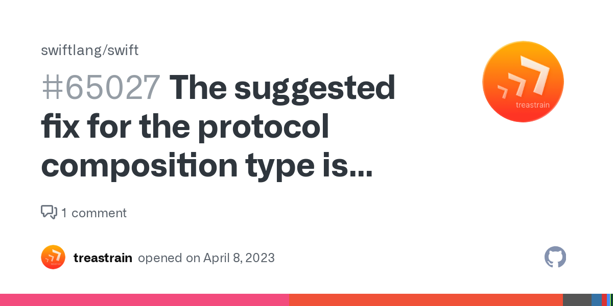 こちらの後者の方も作りました (2つ以上の protocol や class を & で繋ぐことを "Protocol Composition Type" というんですね… 知りませんでした) The suggested fix for the protocol composition type is incorrect when enable upcoming featureExistentialAny · Issue #65027 · apple/swift https://github.com/apple/swift/issues/65027