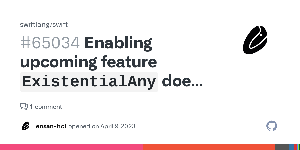 https://discord.com/channels/291054398077927425/430242233468452865/1101133802195124316 Errorで反応しないのはバグだと思います Swift 5.8だとStandard Library(?)のプロトコルは-enable-upcoming-feature ExistentialAnyを素通りしてくる https://github.com/apple/swift/issues/65034