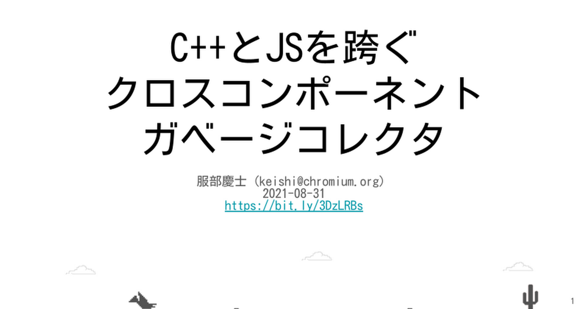 C++とJSを跨ぐ クロスコンポーネント ガベージコレクタ 服部慶士(keishi@chromium.org) 2021-08-31 https://bit.ly/3DzLRBs 1
