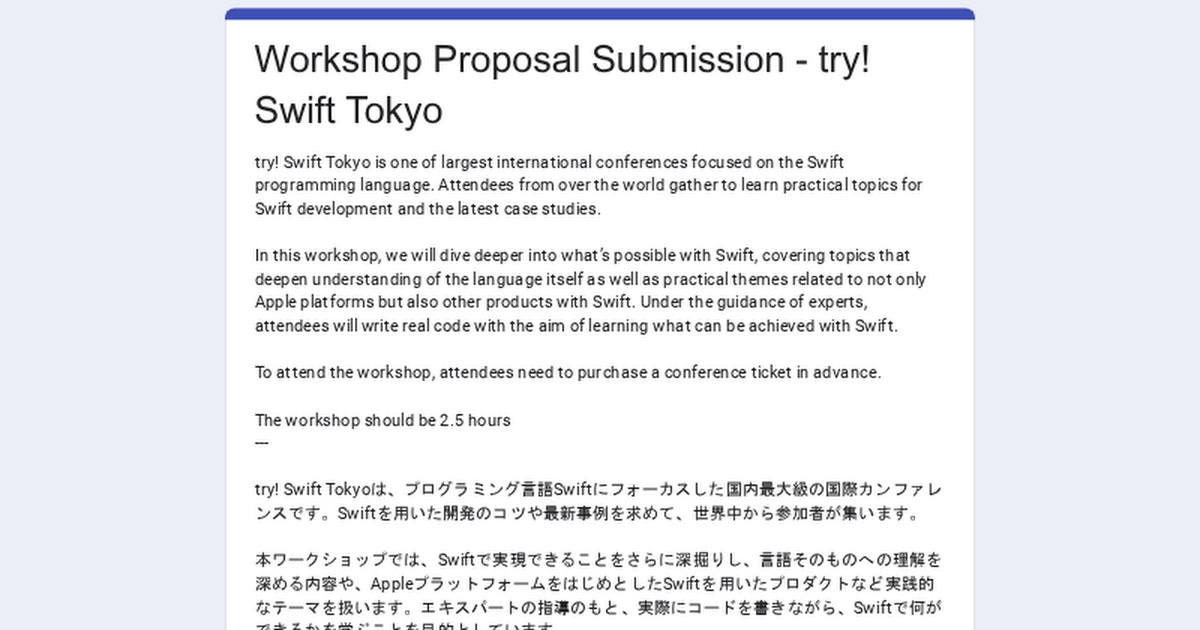 try! Swift Tokyo is one of largest international conferences focused on the Swift programming language. Attendees from over the world gather to learn practical topics for Swift development and the latest case studies. In this workshop, we will dive deeper into what’s possible with Swift, covering topics that deepen understanding of the langua...