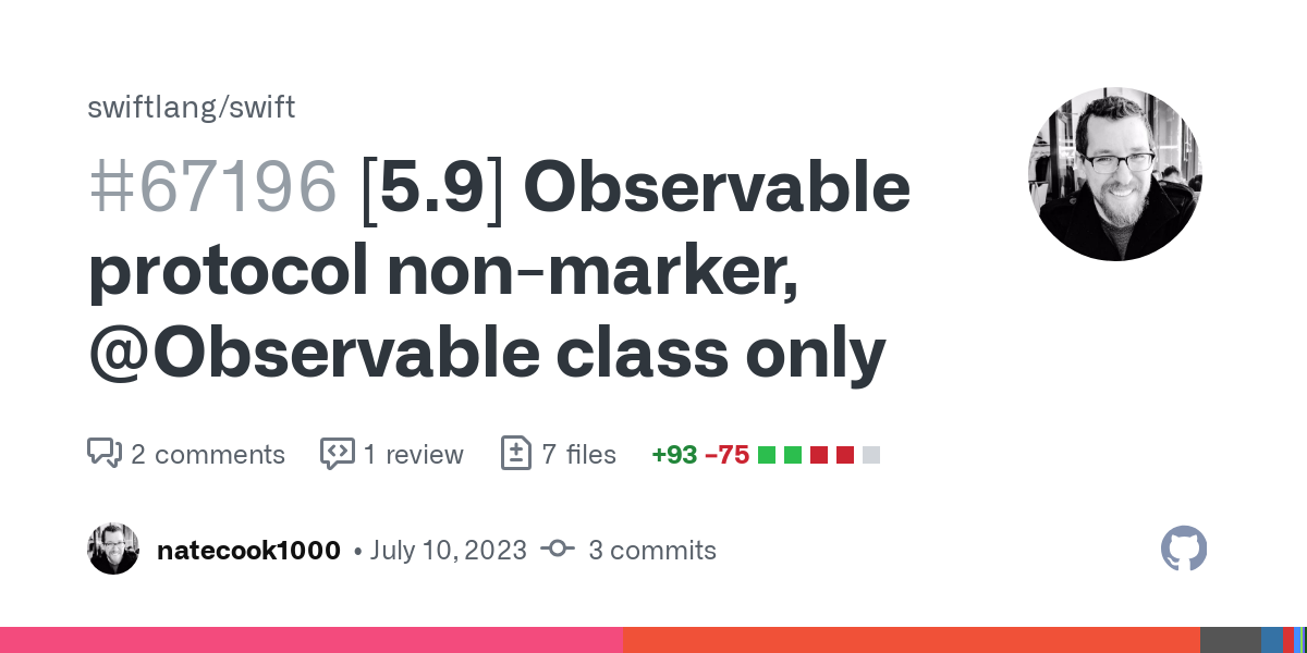最近の変更で @Observable が struct にはつけられなくなってしまいましたね… [5.9] Observable protocol non-marker, @Observable class only by natecook1000 · Pull Request #67196 · apple/swift https://github.com/apple/swift/pull/67196