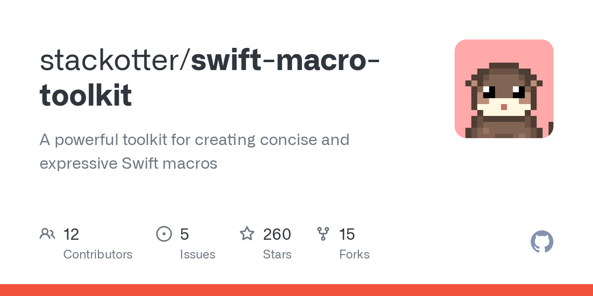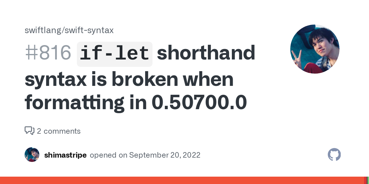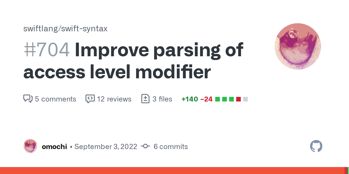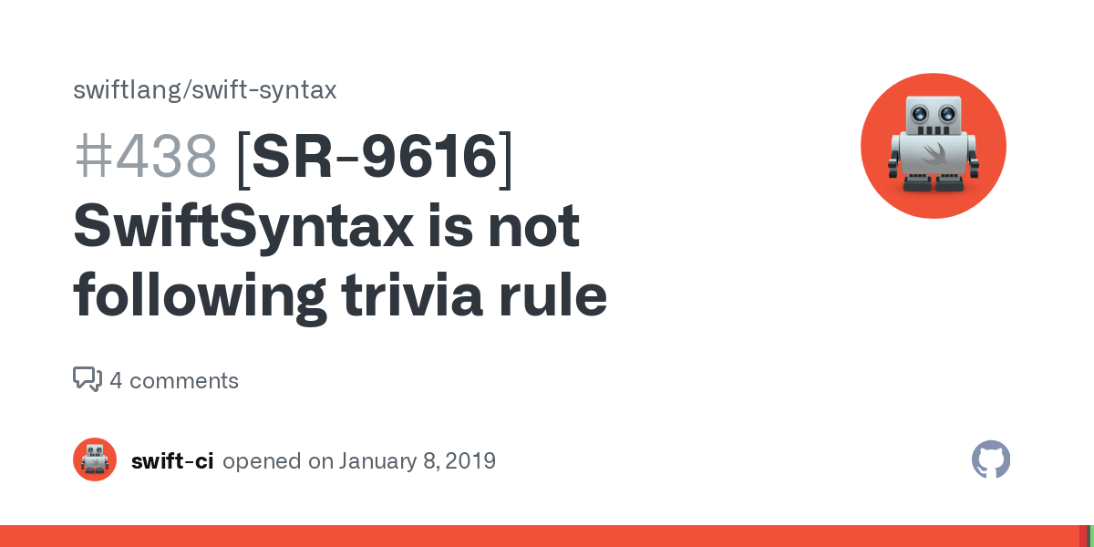 1UIColor(white: 216.0/255.0, alpha: 44.0/255.0) // regexLiteral("/255.0, alpha: 44.0/") (edited)foo.bar を表すんですけど、fooもbarもtokenとしてはidentifierで、 fooのほうはidentifier exprなんですが、barの方はそうじゃない(ただのtoken)、というsyntaxなのかなあ。init( _ unexpectedBeforeBase: UnexpectedNodesSyntax? = nil, base: ExprSyntax?, _ unexpectedBetweenBaseAndDot: UnexpectedNodesSyntax? = nil, dot: TokenSyntax, _ unexpectedBetweenDotAndName: UnexpectedNodesSyntax? = nil, name: TokenSyntax, _ unexpectedBetweenNameAndDeclNameArguments: UnexpectedNodesSyntax? = nil, declNameArguments: DeclNameArgumentsSyntax?, _ unexpectedAfterDeclNameArguments: UnexpectedNodesSyntax? = nil ) { なるほどね。#imageLiteral(...)、#colorLiteral(...)はObjectLiteralExpr、#selector(...)はObjcSelectorExprだったのが最新のSwiftSyntaxだと全部MacroExpansionExprSyntaxになってるな。SwiftRefactor と、それをXcodeから呼び出すための EditorExtension が生まれてた/// ## Before /// /// if let foo = foo { /// // ... /// } /// /// /// ## After /// /// if let foo { /// // ... /// } (edited)public protocol RefactoringProvider { /// The type of syntax this refactoring action accepts. associatedtype Input: SyntaxProtocol = SourceFileSyntax /// The type of syntax this refactoring action returns. associatedtype Output: SyntaxProtocol = SourceFileSyntax /// Contextual information used by the refactoring action. associatedtype Context = Void /// Perform the refactoring action on the provided syntax node. /// /// - Parameters: /// - syntax: The syntax to transform. /// - context: Contextual information used by the refactoring action. /// - Returns: The result of applying the refactoring action, or `nil` if the /// action could not be performed. static func refactor(syntax: Self.Input, in context: Self.Context) -> Self.Output? } なんか入力と出力がワンファイルな雰囲気(Output = SourceFileSyntax)はあるけどどうなんだろう (edited)Package.swift を自動編集するコードをSwiftSyntax上で組もうとしてるけど思いの外難しい (edited)SyntaxRewriter.visitChildren は RawSyntax とか使ってるのでコピペできないnode.children は取れるけど、それを map { visit($0) } した配列からノードに戻す方法がないFunctionCallExprSyntaxBuilder みたいな具体的なbuilderを使って子ノードを具体的に置き換えていくコードを明示的に書かないといけない?## Syntax Nodes A syntax tree is made up of elements called syntax nodes. To help categorize and organize syntax nodes, SwiftSyntax defines a hierarchy of protocols for syntax nodes. At the top of this hierarchy is the ``SyntaxProtocol`` protocol. To represent related categories of syntax, ``SyntaxProtocol`` is further refined: - ``DeclSyntaxProtocol`` for declarations like `struct`s, `class`es, `enum`s and `protocol`s. - ``StmtSyntaxProtocol`` for statements like `if`, `switch`, and `do`. - ``ExprSyntaxProtocol`` for expressions like function calls, literals, and closures - ``TypeSyntaxProtocol`` for types like `Array<String>`, `[String: String]`, and `some Protocol` - ``PatternSyntaxProtocol`` for patterns like `case (_, let x)` Syntax nodes form the "branches" of the syntax tree, as they are generally high-level collections of one or more syntax nodes. Taken together, these branches form the syntactic structure of the source code. This structure is used by compilers and static analyzers to process source code at a high level. A special kind of syntax node is a ``SyntaxCollection``, which represents syntax with a variable number of children. For example, a code block value can contain zero or more statements in between a pair of braces. To represent these children, a ``CodeBlockSyntax`` value has a ``CodeBlockSyntax/statements`` accessor that returns a ``CodeBlockItemListSyntax`` value. The elements of this syntax collection are ``CodeBlockItemSyntax`` values. これいいな。こういう体系的な情報はドキュメントに書いてくれないとわからんから。できれば網羅して書いてほしいけど。There are two Rules of Trivia that you should obey when parsing or constructing new Syntax nodes: A token owns all of its trailing trivia up to, but not including, the next newline character. Looking backward in the text, a token owns all of the leading trivia up to and including the first newline character.0.50700.0 より 0.50700.1 のほうがいいと思いますー!✨0.xxx じゃないけど sem ver 準拠はしてるのかな"#!/bin/env swift" を解釈するようになった。Swiftをスクリプトっぽく動かすのが便利になるような機能が入るのかしら。@package(...) import Yams って感じらしい@package もSwiftSyntaxでパースできるようになったのかな? /// A script command, starting with '#!'. case shebang(String)Syntax.syntaxTextBytes のみが不正UTF8バイトシーケンス取得できるとおもいます。 https://github.com/apple/swift-syntax/blob/cb3f64d9d4f0efeb23cab8fe458e5195b8900089/Sources/SwiftSyntax/Syntax.swift#L553-L557Syntax.syntaxTextBytes のみが不正UTF8バイトシーケンス取得できるとおもいます。 https://github.com/apple/swift-syntax/blob/cb3f64d9d4f0efeb23cab8fe458e5195b8900089/Sources/SwiftSyntax/Syntax.swift#L553-L557 "#️⃣ がエスケープリテラルを閉じる "# として処理されてしまっている?# + variation selector + enclosing keycap らしいdouble quote + ascii pound 」の並びになっていて、エスケープリテラルの閉じカッコがあるようにみえる。 ゴミは右側に付いてるんだ、これは難しいな 先読みしないとわからないぞ。 (edited)⃣ ↑(単体の囲み文字) がどうしてもエラーを引き起こしてしまう (edited)let 🇯🇵 = "Japan" let 😕🏻🦰 = "first character is not an `Emoji_Modifier_Bas