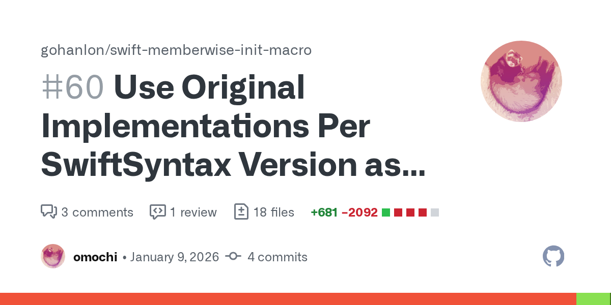 1#elif で空のPlatformMutex実装をつっこんでいただければ良いかなと思います。それか threads.h ありな環境なら #elif __has_include(<threads.h>) で mtx_t での実装もありかも https://github.com/swiftlang/swift-syntax/blob/56a746db8ffb4f864f6df82993bf46f47f95b766/Sources/_SwiftSyntaxCShims/PlatformMutex.c#L83-L85#elif で空のPlatformMutex実装をつっこんでいただければ良いかなと思います。 AvailableInProd が false な機能なのに...)<602 だconformingTo protocols: [TypeSyntax], の方を使うとSwiftSyntaxの下限のどこが切れるのかがよくわかんないなwarning: 'swift-syntax': found 1 file(s) which are unhandled; explicitly declare them as resources or exclude from the target ***/.build/checkouts/swift-syntax/Sources/SwiftLexicalLookup/CMakeLists.txt (edited)