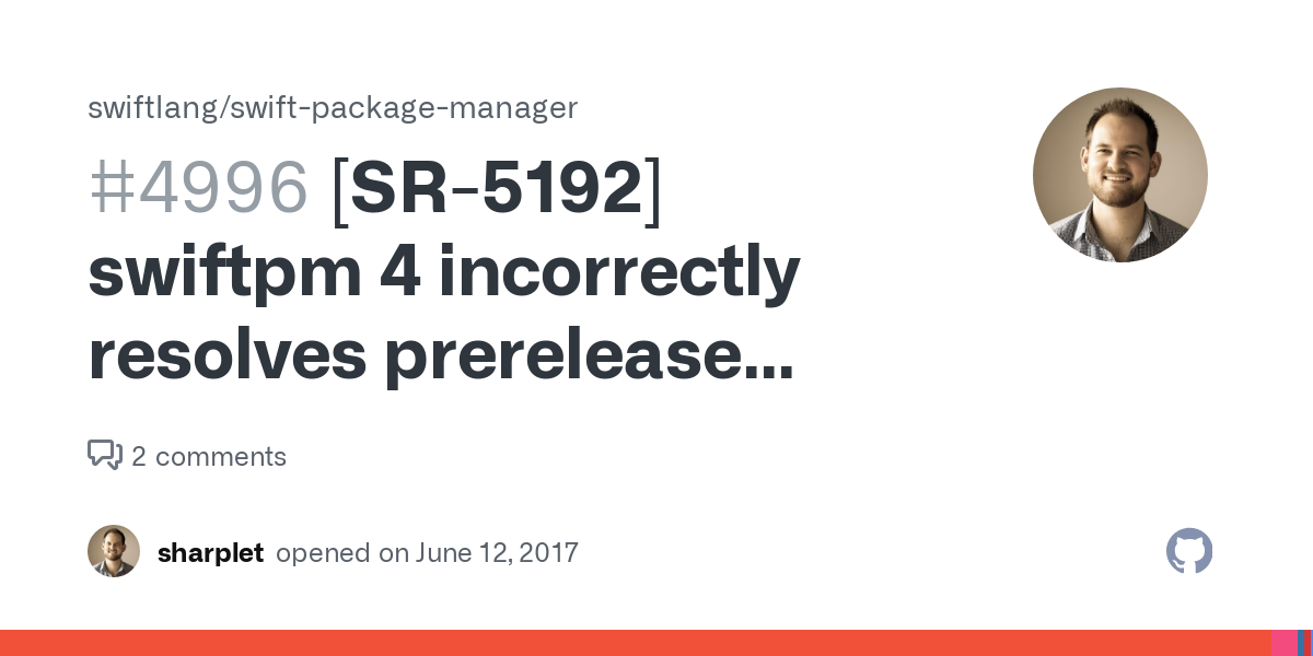 1"510.0.0"..<"600.0.1" だとマッチしなくて "510.0.0-latest"..<"600.0.1" だとマッチしますね.なんかバージョン比較のロジックに欠陥があるように見えます.true だったんで,Range<Version> 自体は問題なくて,何か SwiftPM が余計なことをしてそうですね. assert(Version("600.0.0-beta") < Version("600.0.0")) assert(Version("510.0.0") <= Version("600.0.0-beta")) assert((Version("510.0.0")..<Version("600.0.0")).contains(Version("600.0.0-beta"))) assert((Version("510.0.0")..<Version("600.0.0")).contains(Version("600.0.0-prerelease-2024-05-07")))Version が使われていたんでそっちも覗いてみたら,こいつが犯人っぽいですね.なぜこんなルールにしたのだろうか... https://github.com/apple/swift-tools-support-core/blob/b170d46b94d6c1cd91db97d2e3a1e0bdb5b79a24/Sources/TSCUtility/Version.swift#L347-L360 (edited)