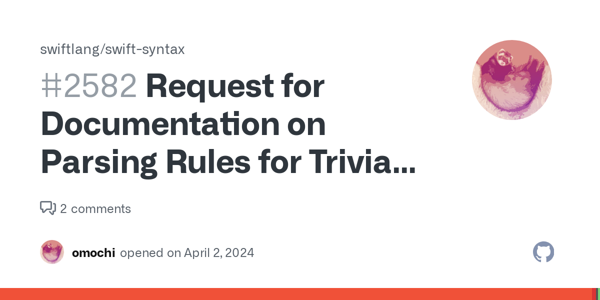 1-skipMacroValidationという方法もあるみたい。let str = """ foo bar """ 複数行文字列リテラル内部 開始""" の改行はその trailing trivia になり、また各行の改行は trivia ではなく トークンの一部としてパースされます。(リテラル内部最終行を除く) (edited)textSegment("/**/\n") じゃなくて/**/\n が トリプルクォートのtrailing triviaでも良い気がする" " って感じだけどそんな概念はないかwrintaro@rintaro-m1macbookpro swift-syntax % ./.build/debug/swift-parser-cli print-diags test.swift === test.swift:2 === 1 │ 2 │ let str = """/* foo */ │ ╰─ error: multi-line string literal content must begin on a new line 3 │ foo 4 │ なんで、ParserDiagnosticsではじかれる感じですね.package( url: "https://github.com/apple/swift-syntax", "508.0.0"..<"510.0.0" ) SwiftSyntaxへの依存は範囲で書く、っていうのはその通りっぽいな。これからそうしよう。 https://www.pointfree.co/blog/posts/116-being-a-good-citizen-in-the-land-of-swiftsyntax 下限 ..< 現在リリースされている最新版から 2 個先のメジャーバージョン という認識です. (edited)<510 で押さえたら、 510 の マイナス付きバージョンが含まれてしまうのか。 (edited)508.0.0 ..< 509.999 みたいな書き方がいいのか・・・? (edited)..<"600.0.0" になっているはずですね.だとしたら問題なかったです. 問題を混同してました.600.0.0 の prerelease が降ってきてしまうのは直接 swift-syntax に依存している場合じゃなくて swift-testing 経由で間接的に依存している場合でした.これは意図してそうなっているので問題なかったですね. https://github.com/apple/swift-testing/blob/0.8.0/Package.swift#L36 (edited)..<600.0.0 に対して 600.0.0-beta とかはマッチしませんでしたっけ? x-beta < x だからVersion の < の実装を読むと普通にマッチしそうに見えますが,実際に試してみると "510.0.0"..<"600.0.0" でも "510.0.0"..<"600.0.0-latest" でも "510.0.0"..<"600.0.1" でもマッチしなくて,"510.0.0"..<"600.0.1-latest" でようやくマッチしますね. https://github.com/apple/swift-package-manager/blob/4a6660ac95f4b2f88e1006f84576b0ca16343eb9/Sources/PackageDescription/Version.swift#L121