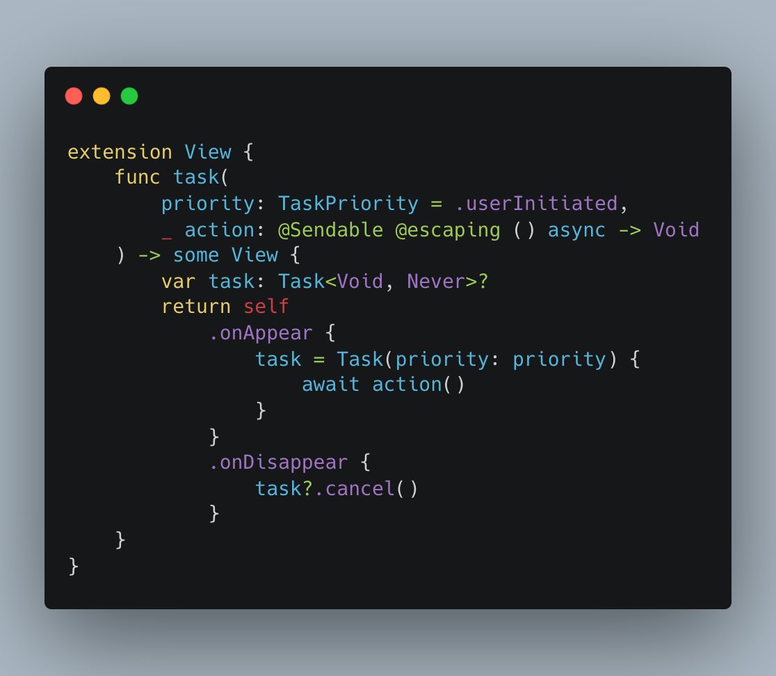 SKScene があってインスタンスを切り替えているということですか?GameTitleScene の中で override func touchesEnded(_ touches: Set<UITouch>, with event: UIEvent?) { if self.atPoint(self.firstTouch).name == "start" { guard let t = touches.first else { return } self.lastTouch = t.location(in: self) let touchPoint = self.atPoint(self.lastTouch) if touchPoint.name == "start" { self.startButton.fillColor = UIColor.clear self.view?.presentScene(GameScene(size: self.size)) } } } のように呼び出しています.environment(\.colorScheme, .dark) を使っているんですが、同じ用にハイコントラストモードの見た目を確認したくて .environment(\.colorSchemeContrast, .increased) のようにすると Key path value type 'WritableKeyPath<EnvironmentValues, ColorSchemeContrast>' cannot be converted to contextual type 'KeyPath<EnvironmentValues, ColorSchemeContrast>' となって、 API リファレンスを確認すると UIAccessibilityContrast.high に相当するのがあるかと思ったけどなさそうだった。ないのかな。ColorSchemeContrast.increased があるんですが、 "Your app cannot override the user’s choice." で set できないようです。ColorSchemeContrast.init?(UIAccessibilityContrast) のイニシャライザがあるみたいなのでそれに UIAccessibilityContrast.high 渡したら動いたりしないかな。ColorSchemeContrast.increased 自体は取得できるんですが、 .environment(\.colorSchemeContrast, .increased) しようとすると https://developer.apple.com/documentation/swiftui/environmentvalues/colorschemecontrast が read-only なので上書きできない状況ですね。 (edited)ContentView() .environment(\.colorScheme, .dark) .environment(\._colorSchemeContrast, .increased) Underscore付けたらセットできました。。。struct ContentView: View { var body: some View { VStack { Text("Hello, world!") .padding() .background(Color("sampleColor")) .environment(\.colorScheme, .light) Text("Hello, world!") .padding() .background(Color("sampleColor")) .environment(\.colorScheme, .dark) Text("Hello, world!") .padding() .background(Color("sampleColor")) .environment(\.colorScheme, .light) .environment(\._colorSchemeContrast, .increased) Text("Hello, world!") .padding() .background(Color("sampleColor")) .environment(\.colorScheme, .dark) .environment(\._colorSchemeContrast, .increased) } } }colorSchemeContrast が混ざるのはさすがにおかしい気がして、僕がやっているのは previews の中でそれぞれ指定した場合(プレビュー上で別の iPhone に表示される場合)ですね。init<S: StringProtocol>(_ title: S, text: Binding<String>)が優先されてinit(_ title: LocalizedStringKey, text: Binding<String>)が優先されなくなった? struct ContentView: View { @State private var text = "" var body: some View { if #available(iOS 15, *) { TextField("foo", text: $text) // "foo"はLocalizedStringKey扱い } else { TextField("foo", text: $text) // "foo"はString扱い } } } (edited)public init(_ titleKey: LocalizedStringKey, text:, onEditingChanged:) @_disflavoredOverload public init<S: StringProtocol>(_ title: S, text:, onEditingChanged:) iOS15から // 1 @_disflavoredOverload public init(_ titleKey: LocalizedStringKey, text:, onEditingChanged:) // 2 @_disflavoredOverload public init<S: StringProtocol>(_ title: S, text:, onEditingChanged:) // 3 @available(iOS 15.0) public init(_ titleKey: LocalizedStringKey, text:, prompt:) // 4 @_disflavoredOverload @available(iOS 15.0) public init<S: StringProtocol>(_ title: S, text:, prompt:) こうなった。 (edited)@available(iOS 15.0) を満たさない場合、 _disflavoredOverload 同士の戦いになって、スコアが同じなので_disflavoredOverload で勝敗を捻じ曲げる前の本来のオーバーロード解決で評価されて、 2が勝ってるんですね。 (edited)extension View { func task( priority: TaskPriority = .userInitiated, _ action: @Sendable @escaping () async -> Void ) -> some View { var task: Task<Void, Never>? return self .onAppear { task = Task(priority: priority) { await action() } } .onDisappear { task?.cancel() } } }body が走る度に走ってうまくいかなさそうな気がしてきた・・・。ObservableObjectの普通のプロパティが$ob.propertyでアクセスすると、Bind<PropertyType>として扱えるのは、ObservableObject.Wrapperの仕組みと認識しているのですけれど、この辺りについてのドキュメントなどご存知の方いたら教えてほしいです。少し探したのですけれど、見当たらず… (もしくはこの認識が間違っていたら教えてほしいです) https://developer.apple.com/documentation/swiftui/observedobject/wrapper$ob で ObservableObject.Wrapperが返ってくるところまでは理解されていると思います。これはpropertyWrapperのprojectedValue の仕組みでObservableObject<T>.Wrapper が返ってきているためです。 このWrapperにはさらにKeyPath Dynamic Member Lookupが実装されており、Tに生えてる任意のプロパティを https://developer.apple.com/documentation/swiftui/observedobject/wrapper/subscript(dynamicmember:) を経由して取り出しています。見え方が普通のプロパティアクセスになっているところが特殊です。projectedValue → https://github.com/apple/swift-evolution/blob/96a70cd71258d24ad3972c6433a2a45ee255ccf6/proposals/0258-property-wrappers.md#projections KeyPathMemberLookup → https://github.com/apple/swift-evolution/blob/0c2f85b3ae42539a7cd47fca2473a0bf6f345566/proposals/0252-keypath-dynamic-member-lookup.mdObservableObject.Wrapper(StateObject<Type>と認識してますObservableObject<Type>.Wrapperが正ですね)にプロパティが存在するわけではなく、動的にプロパティを生成して存在しているように見せているという感じなのですね