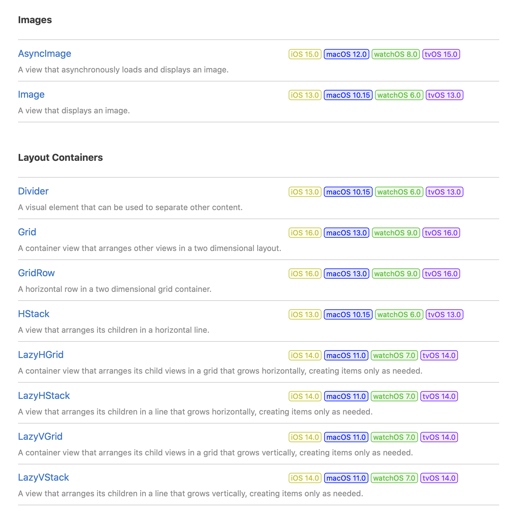 UIViewControllerRepresentable と UIPageViewController 使えばいいんですが、面倒だなと・・・。struct ContentView: View { var body: some View { if Bool.random() { Text("abc") } else { Color.red } } } (edited)if は使えるけど、昔は中身同じ型じゃないとダメだったはず https://yanamura.hatenablog.com/entry/2019/09/05/150849bodyが@ViewBuilder になってますね。いつからでしょう。 (edited)UIInterfaceOrientation を取得する方法ありますか?( UIDeviceOrientation ではない方)AVCaptureVideoPreviewLayer を使わないで純粋にPixelBufferをCGImageに直してImageを作る方法でカメラアプリを作ってますが、そのためにはデバイスの向きよりもUIの向きを取得しないといけないので UIApplication.shared.windows.first?.windowScene?.interfaceOrientation 無理矢理感がありますが、これダメですか?CVImageBuffer を直接使う系のアプリで UIDevice.current.orientation から switch で UIInterfaceOrientation を生成する方法なら使ったことがありますね。 (edited)UIDevice から取れますね。extension Hoge から UIApplication 使えないってことです?extension Hoge から UIApplication 使えないってことです? CGImage 使って Image でプレビュー出すと遅延が結構出る(0.5秒くらい?)ので、諦めて素直に AVCaptureVideoPreviewLayer 使うことにしました UIViewControllerRepresentableのframe問題、iOS14だとmakeUIViewControllerの中でintrinsicContentSizeでいいサイズを計算してpreferredContentSizeに設定してやったVCをreturnするとうまくSwiftUI側に認識されそうですね。ScrollViewのスクロール方向のConstraintをsystemLayoutSizeFittingで作ったらうまくいきました。iOS13はダメです。List の中においてる Button ですが、表示は正しくできてるのに、押した時の動作が違うボタンのものになるし、ハイライトもその間違ったボタンが反応しますけどなんで? .tag は関係ないはずです、あっても外しても動作変わらなかったのと、あれそもそも ScrollViewReader の scrollTo メソッド用のものなのでwithAnimation って使いづらくないですか?たとえば、 ObservableObject に適合した ViewModel が非同期的に状態を変更するようなときに withAnimation を適用しようとすると、 ViewModel 側に withAnimation 書かないといけなくないですか? ViewModel に SwiftUI を漏れ出させたくないですが・・・。// これは問題ない if let isFoo = viewModel.isFoo { Text("Hello") } Button("Toggle Foo") { withAnimation { viewModel.isFoo.toggle() } }