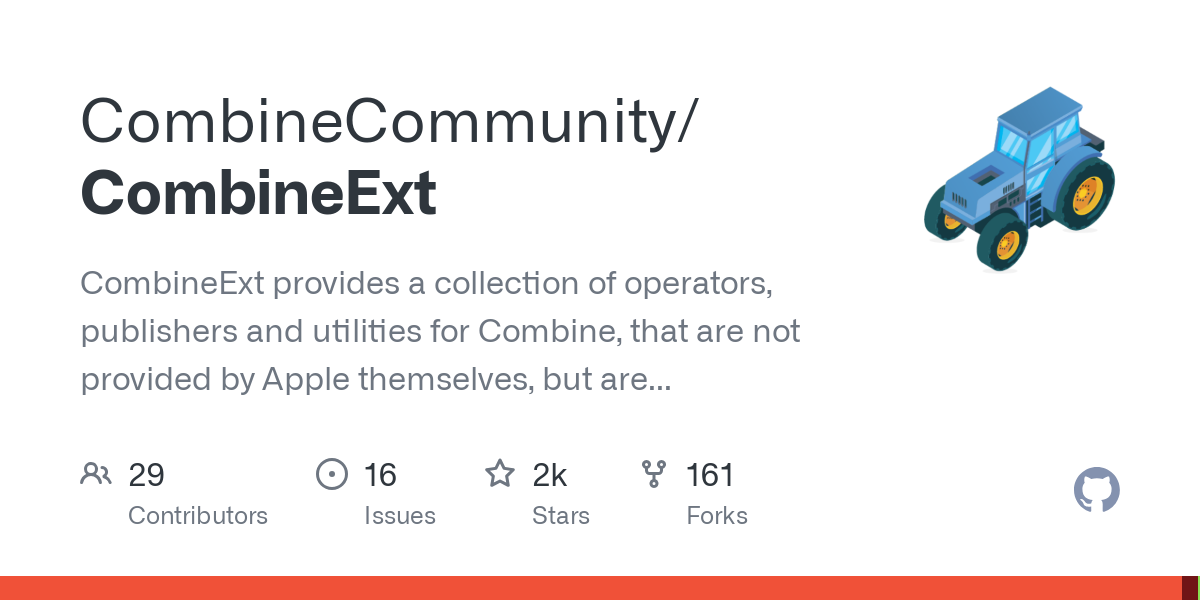 CombineExt provides a collection of operators, publishers and utilities for Combine, that are not provided by Apple themselves, but are common in other Reactive Frameworks and standards. - GitHub -...