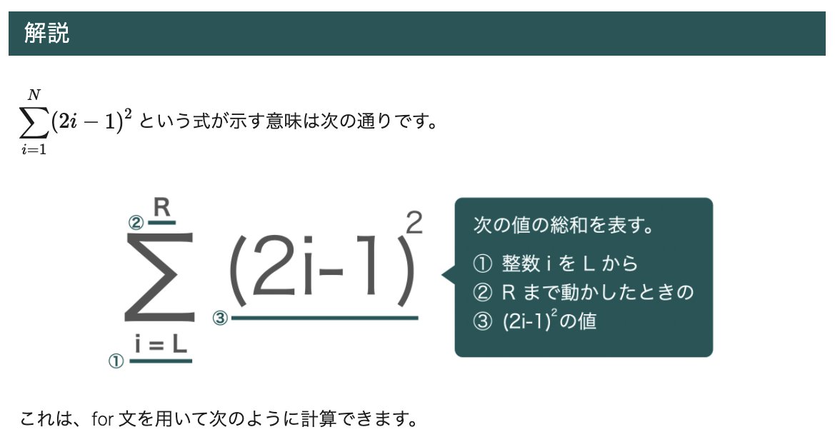 【 #毎日アルゴ式 】 本日 (10/29) の練習問題はこちらです!昨日に続き、「for 文と Σ の関係性」を扱った問題です。 このシリーズでは問題と同時に解説を公開する予定なので、知らない / わからない場合も解説を見ながら挑戦してみてください🐢 https://t.co/LB5QRB7D0x #アルゴ式