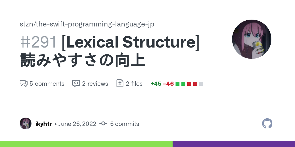 1textlint-disableで無視するようにしました。if letの同名省略の記述を追加(Swift5.7からなのでコメントアウトしています) 特定の列挙ケースの全てのインスタンス だと一つの列挙ケースにたくさんインスタンスがあるということになり、それは変じゃないかと思ったのですが、Swiftの列挙体は値型なので、別の変数に代入すればそれは異なるインスタンスになるのでした。ここは元の文に戻しておきます。 suggestion もし列挙型が Raw Value を持つ場合、これらの値は宣言の一部として決定されます。これはつまり、特定の列挙ケースの全てのインスタンスは、必ず同じ Raw Value を持つということです。もう 1 つの選択肢は、列挙ケースに関連値\(Associated Values\)を持たせることです。関連値はインスタンス生成時に決定され、列挙ケースのインスタンスごとに異なる値を持つことができます。関連値は列挙ケースのインスタンスの格納プロパティのように振る舞います。例えば、サーバから日の出時刻と日の入り時刻をリクエストする場合を考えてみてください。サーバはリクエスト情報に応じたレスポンスを返すか、リクエストが間違っている場合は間違っているという内容を返します。定数、変数、プロパティ、または subscript のようになっている文章が多く、サブスクリプトにしたほうが読みやすいかと思います。